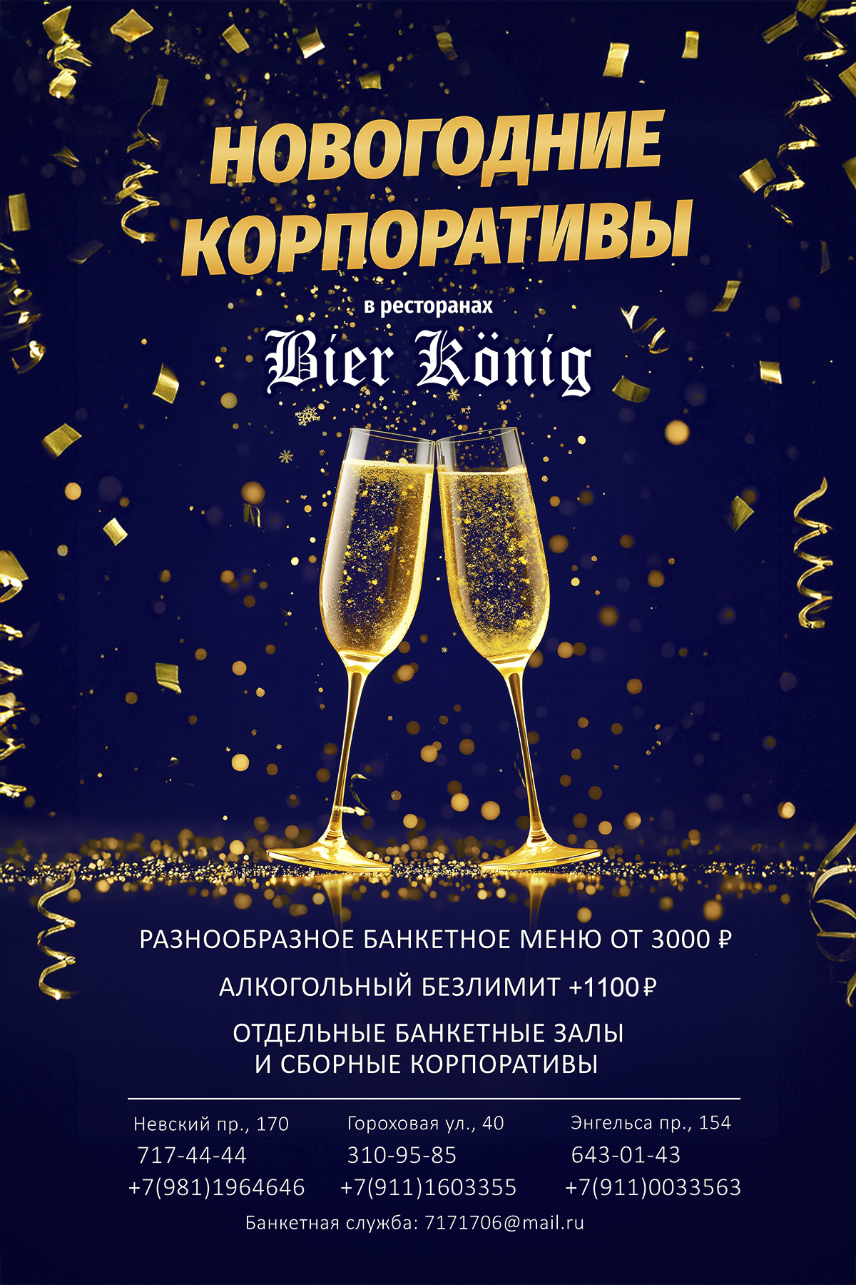 Уважаемые гости! Приглашаем вас отметить в одном из наших ресторанов свой новогодний корпоративный банкет! Специально для Вас мы обновили наши банкетные предложения! Стоимость Банкетного предложения на одну персону от 3000 руб В нашем ресторане действует АКЦИЯ: При заказе банкетного предложения 3000/3700/4500 + 1100 рублей с человека = Алкогольный безлимит! В период с 11.12.2025 на столы от 6 гостей действует депозит 2500 рублей на человека. 26.12.2025 ( Невский и Гороховая) на столы от 4 гостей действует депозит 3000 рублей на человека. […]
