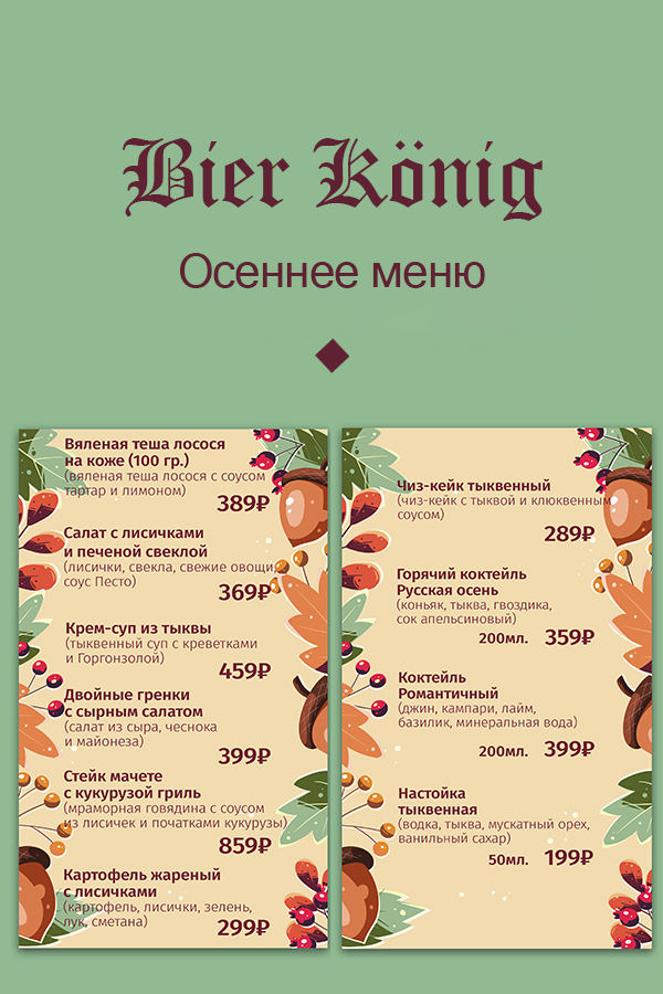 Попробуйте новые блюда и напитки, специально подготовленные нашим шеф-поваром для осеннего сезона. Осень — время уюта и тепла. Каждое блюдо приготовлено с любовью и внимательно подобранными осенними ингредиентами, чтобы передать все богатство этого времени года. Приходите к нам и откройте для себя вкусные традиции осени в наших ресторанах!