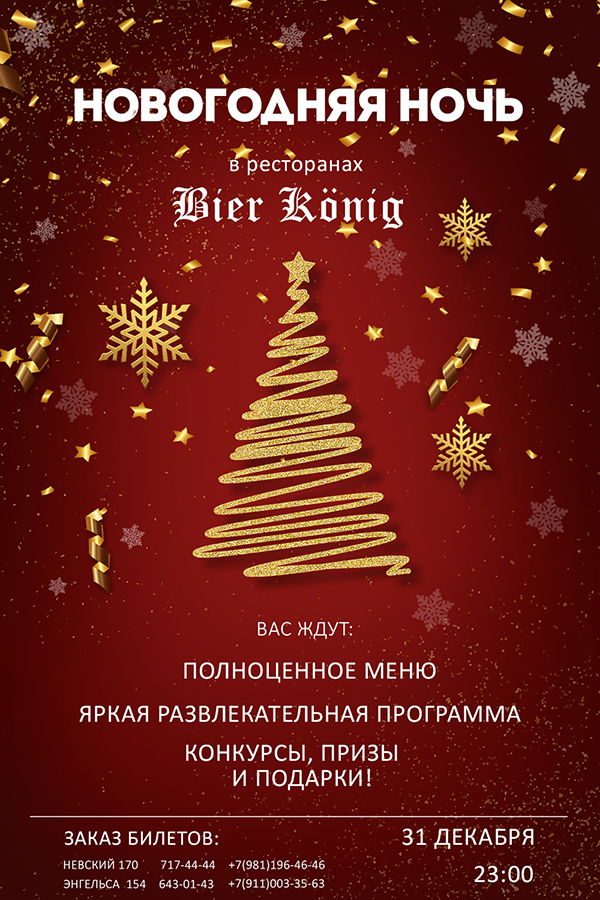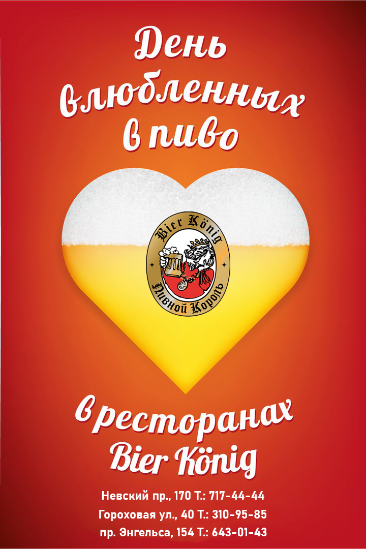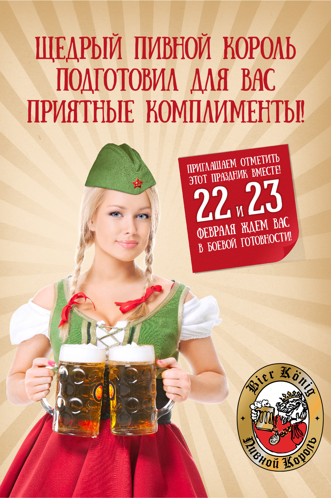 Приглашаем Храбрых сердцем и крепких духом 22 и 23 февраля Отметить День Защитника Отечества в наших ресторанах А щедрый Пивной Король подготовил для Вас приятные комплименты! Заказ столов: Невский пр, д 170, тел 717-44-44 Гороховая ул, д 40, тел 310-95-85 Энгельса пр д 154, ТРЦ Гранд Каньон, 3 этаж, тел 643-01-43