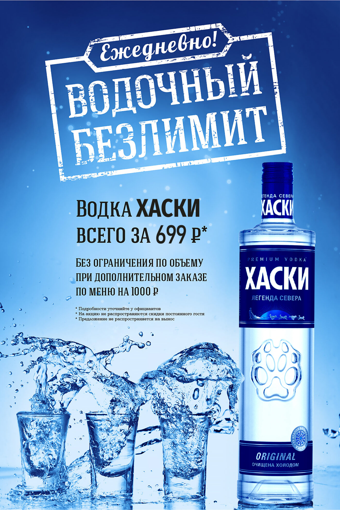 Закажите блюда из нашего меню на сумму от 1000 рублей на одного человека и получите неограниченное количество водки Хаски за доплату всего 699 рублей! Для тех, кто любит крепкий напиток, но не любит считать стопки! Акция действует только при условии участия в ней каждого гостя, находящегося за столом (за исключением беременных женщин и несовершеннолетних лиц).