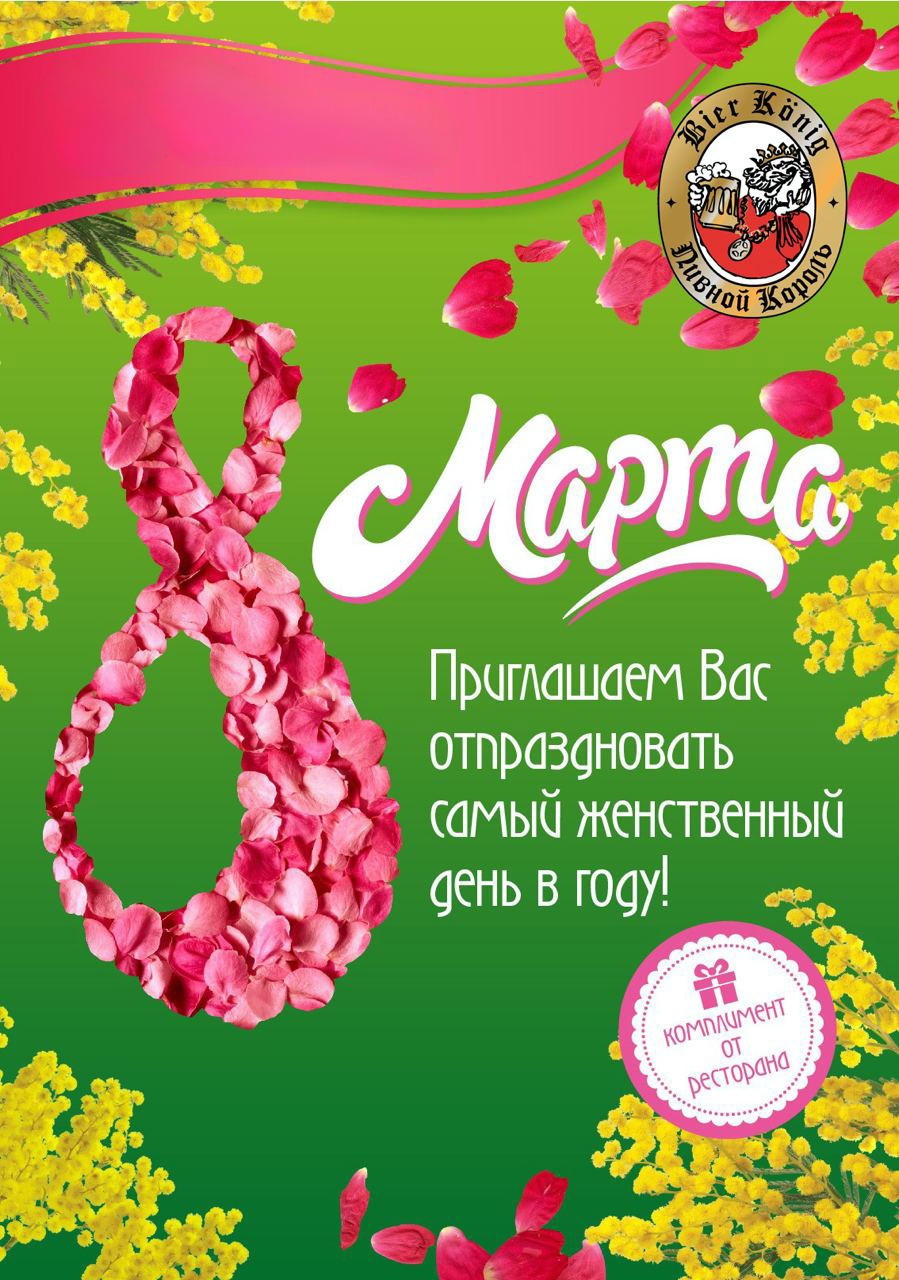 С праздником Весны и Прекрасных Дам! Приглашаем встретить и провести этот прекрасный праздник в сети наших ресторанов! А щедрый Пивной Король 8 марта приготовил для лучшей половины человечества приятные комплименты! Заказ столов по телефонам: Невский пр д 170, тел 717-44-44 Гороховая ул д 40, тел 310-95-85 Энгельса пр, д 154, ТРЦ Гранд Каньон, 3 этаж, тел 643-01-43