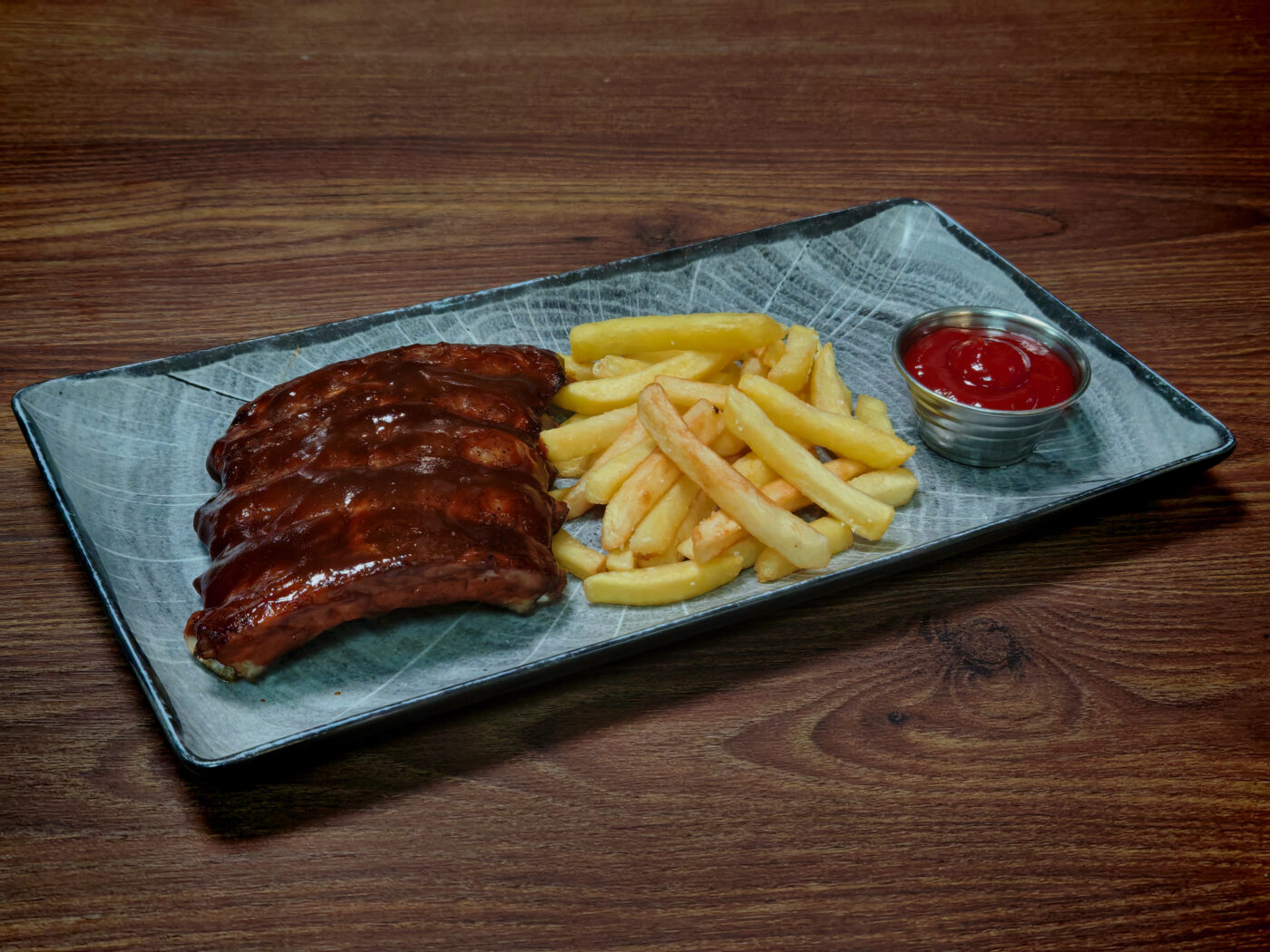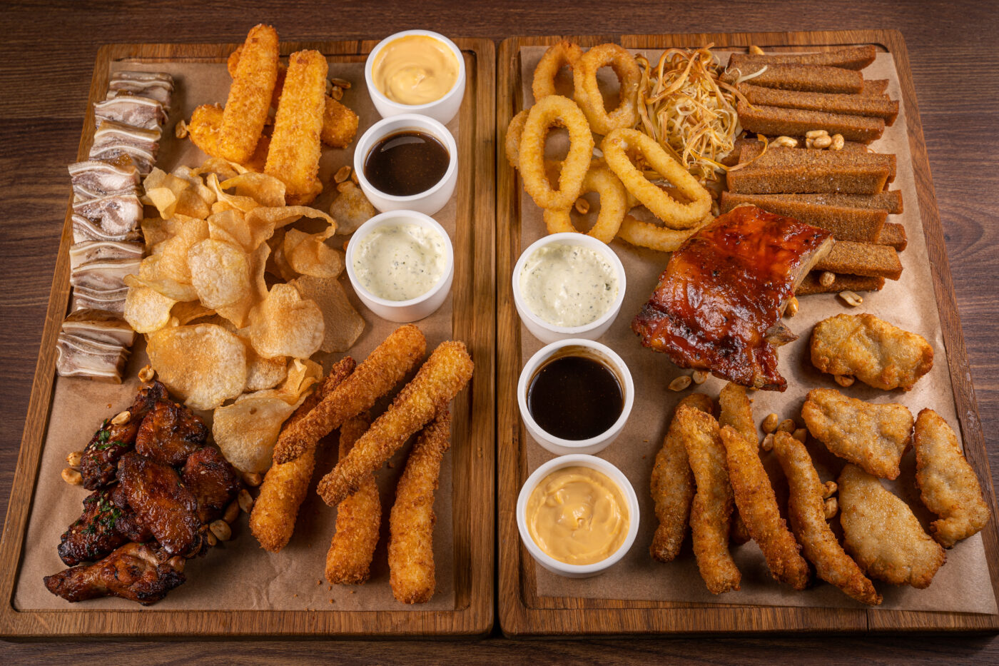 Жареные куриные крылышки, подкопченые поросячьи ушки, креветки тигровые в панировке, сырные палочки, картофельные чипсы, куриные палочки фри, жареные свиные ребра, треска в панировке, кольца кальмара в кляре, хлебные гренки, сыр косичка, соусы тартар, сырный и соевый острый.