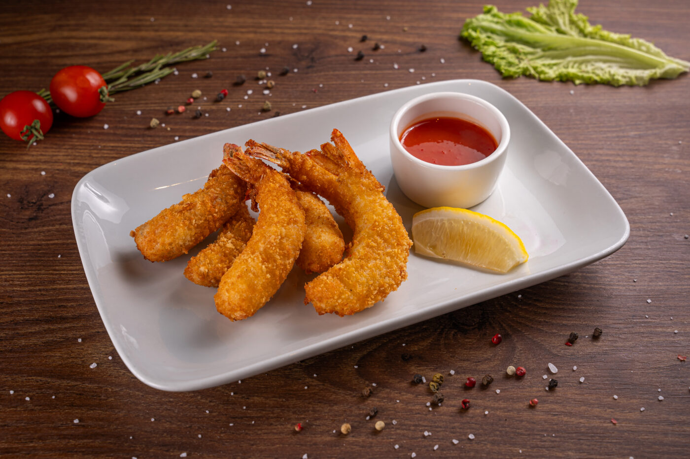 Креветки тигровые в хрустящей панировке Панко с соусом сладкий чили.