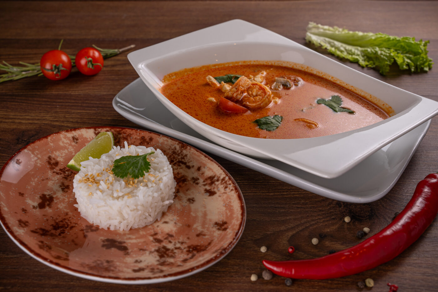 Паназиатский суп с креветками, кальмарами, курицей и шампиньонами. Подается с рисом Басмати.